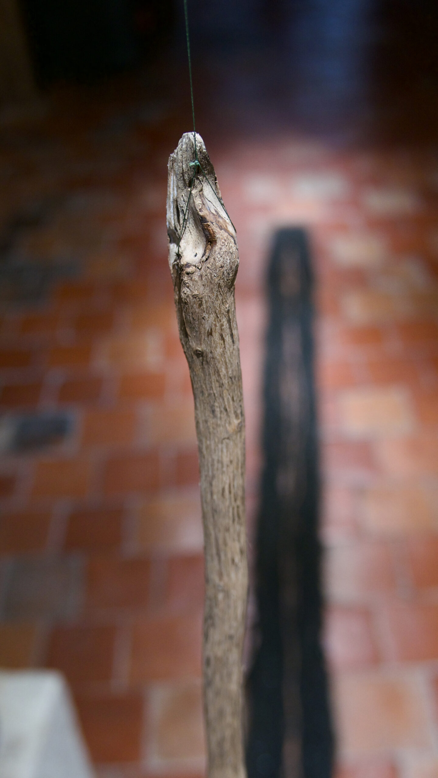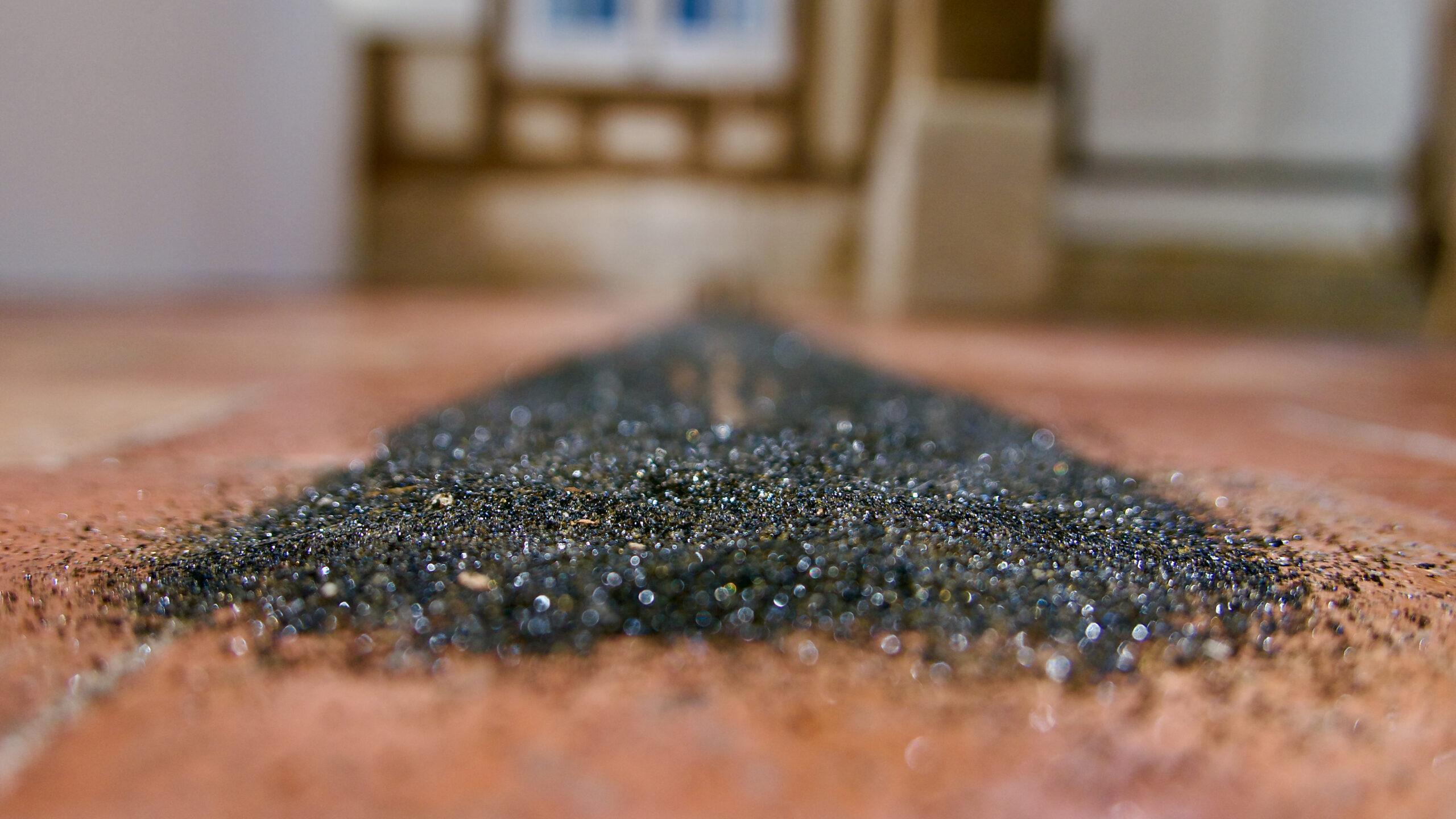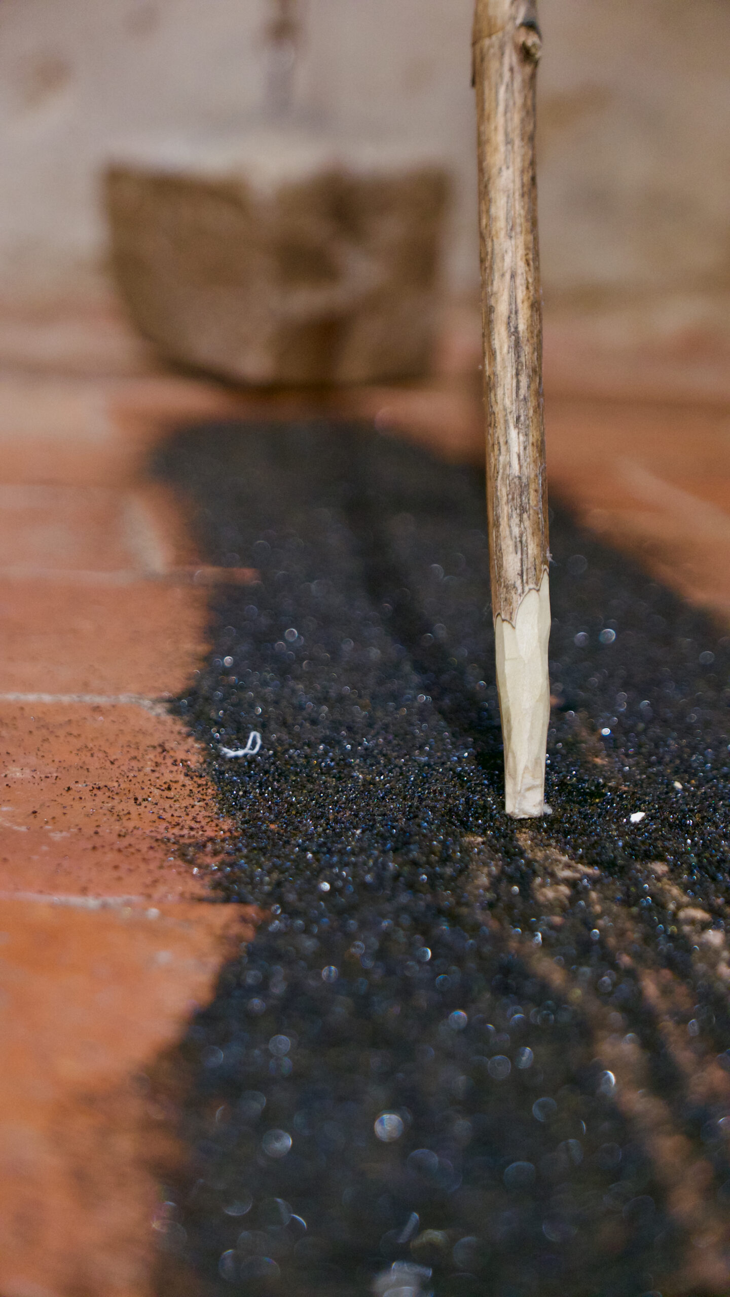 L’œuvre ouvre un espace de réflexion sur la conquête des territoires – entre inclusion et exclusion. L’installation propose un geste minimal : un bâton trace des lignes dans le sable noir. Chaque passage redéfinit l’espace, déjoue la fixité des territoires et interroge la production même des divisions. La ligne devient événement qui fait et défait la frontière. Elle interroge la condition politique de toute délimitation : une temporalité fragile, poreuse, une géographie instable qui questionne l’identité et la souveraineté.